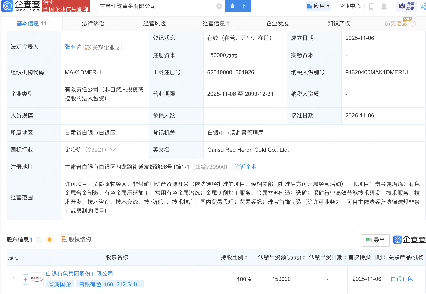 近日2023配资炒股,甘肃红鹭黄金有限公司成立,注册资本15亿元,经营范围包含:常用有色金属冶炼;金属切削加工服务;金属材料制造;选矿;采矿行业高效节能技术研发等。企查查股权穿透显示,该公司由白银有色(601212)全资持股。